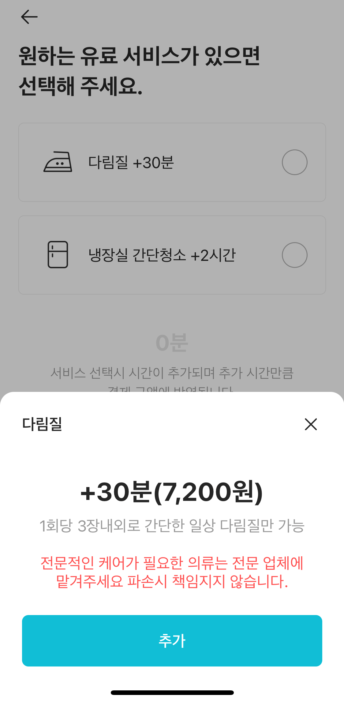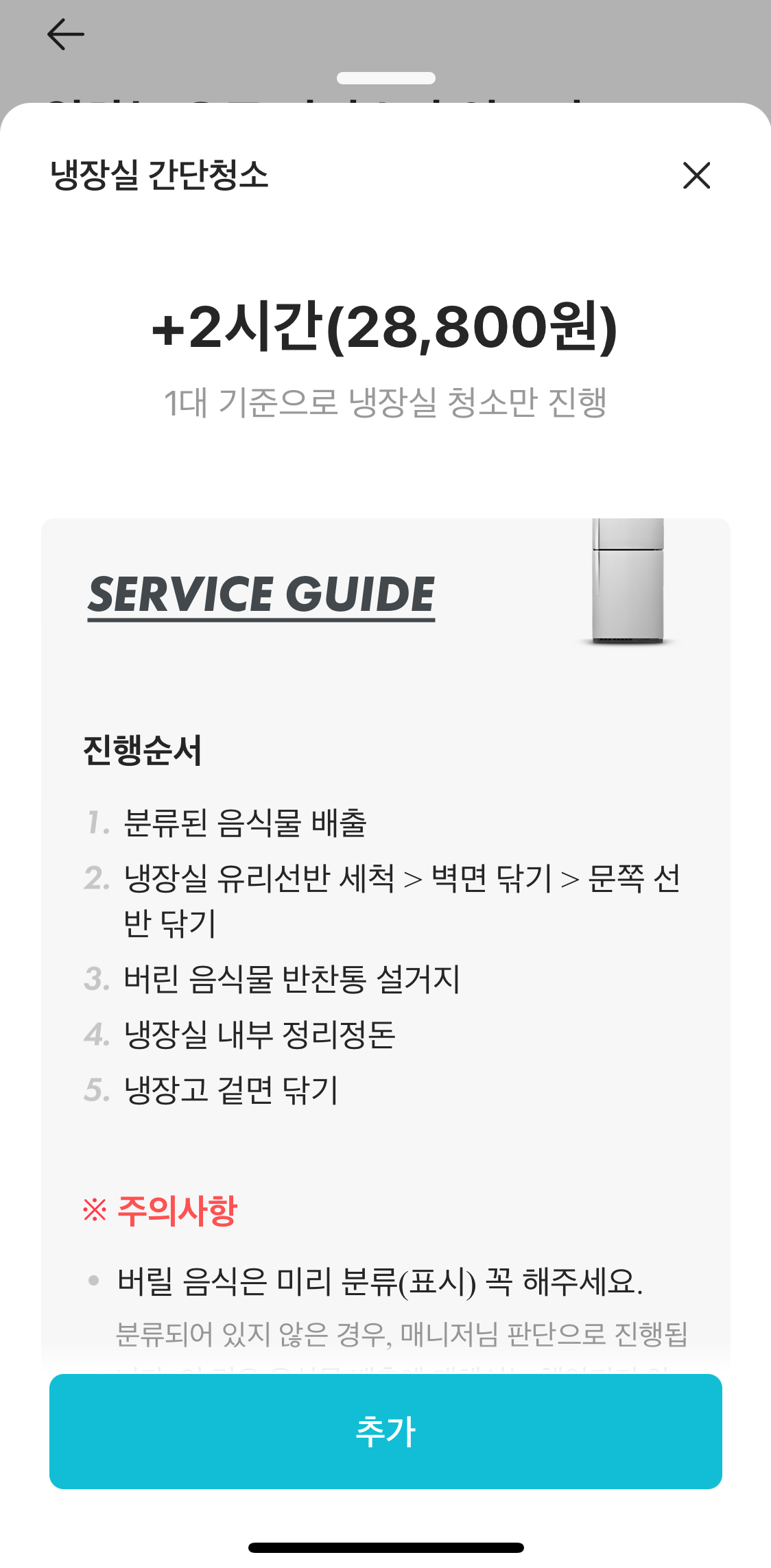 또한 냉장실 서비스를 선택할 경우 1대 기준으로 2시간 정도가 추가되고, 냉장실 내부 정리와 음식물 청소, 버린 음식물 통 세척 등을 포함하여 28,800원이다. 단, 여기에는 냉동고 청소가 포함되지 않는다. 다림질도 요청할 수 있는데 1회당 3장 내외의 간단한 일상 다림질로 30분 정도가 추가되고 7,200원이다.
