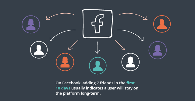 하지만 새 사용자가 서비스에 들어왔을 때 10일 내 7명의 친구를 만들어주면 좋아요, 공유하기, 댓글 등의 관계를 형성하면서 페이스북의 핵심 가치를 이해할 수 있게 되는 것이다.